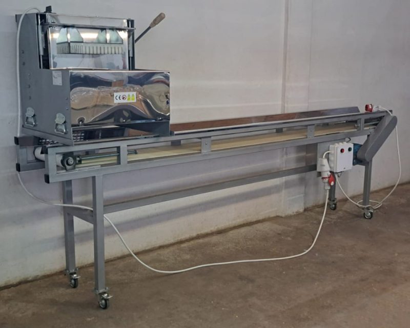 Моделът SMK-2 е предназначен за нарязване на пресни гъби на кубчета и е допълнително оборудван с транспортна лента, която автоматично отвежда нарязаните кубчета до следващия етап в производствения процес.