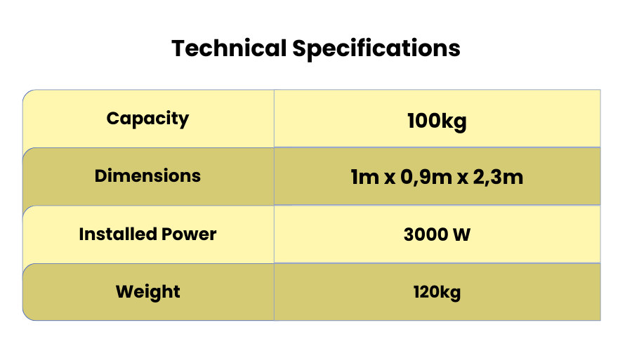 This dryer uses electricity as its power source and is available in three models with capacities of 50kg, 100kg, 200kg and 400kg per day.