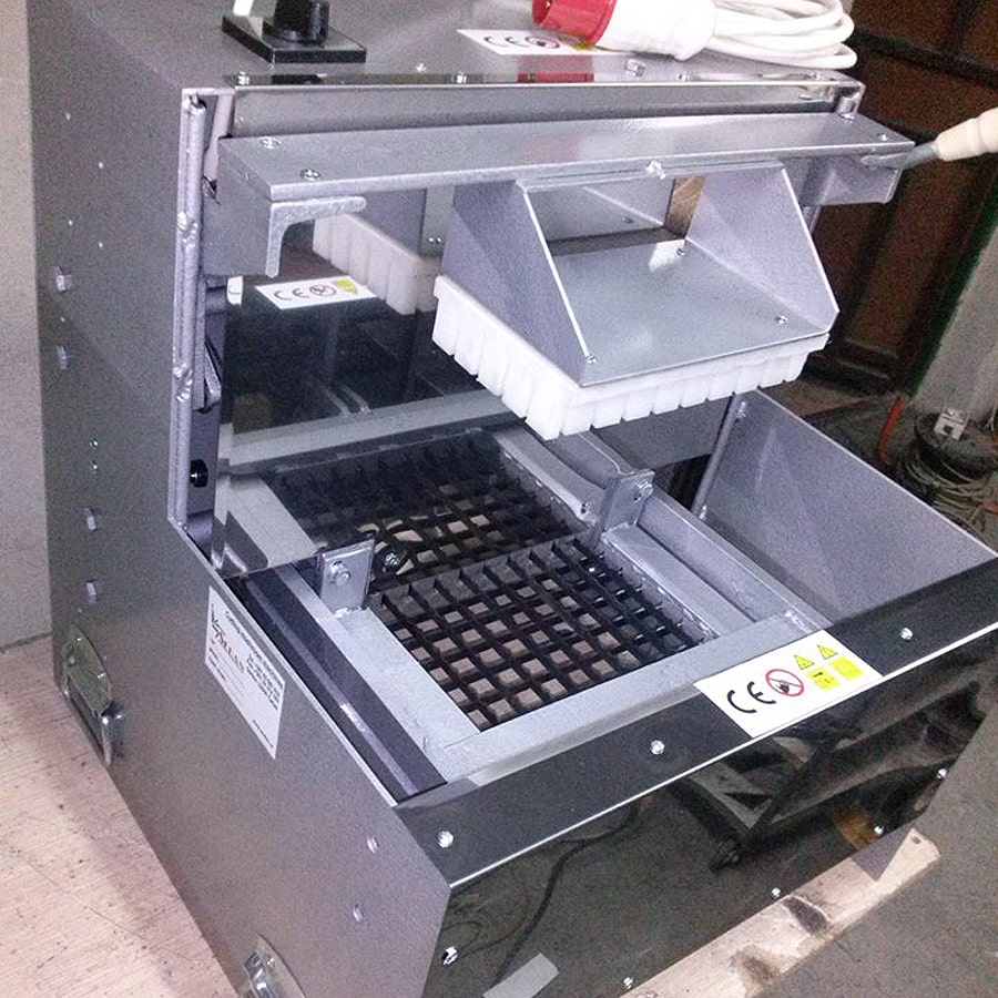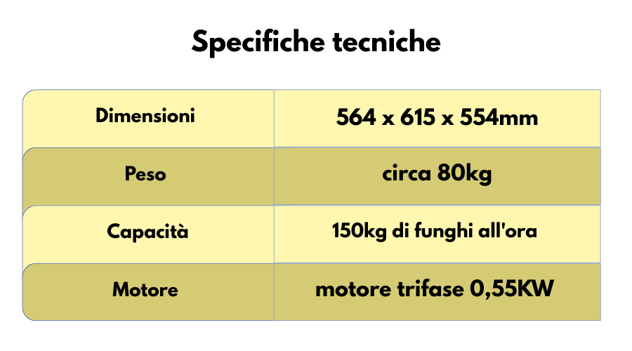 Il corpo della macchina è realizzato in acciaio resistente, mentre tutte le parti a contatto diretto con i funghi sono in acciaio inox e plastica per uso alimentare.