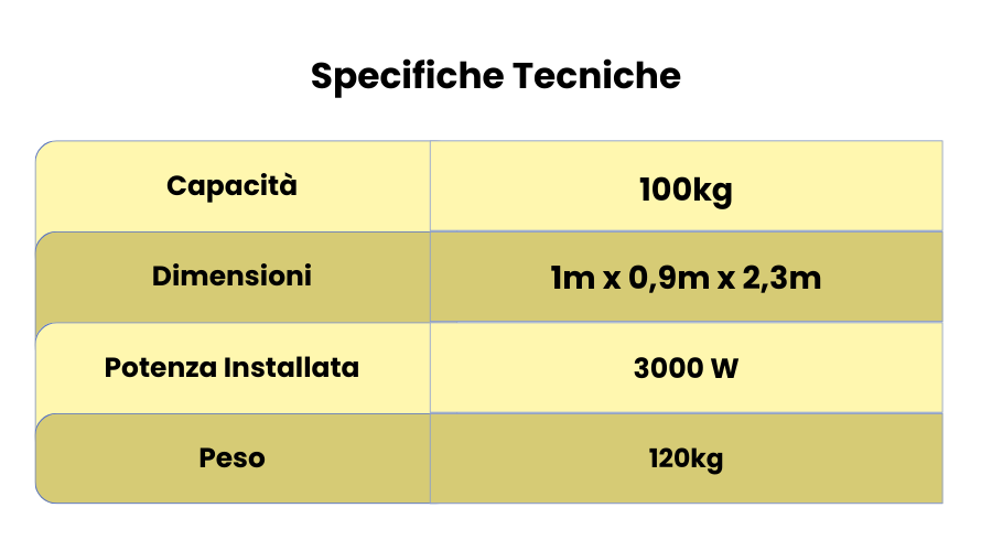 L’essiccatore utilizza l’elettricità come fonte di alimentazione ed è disponibile in tre modelli con capacità giornaliera di 50 kg, 100 kg, 200kg e 400 kg.