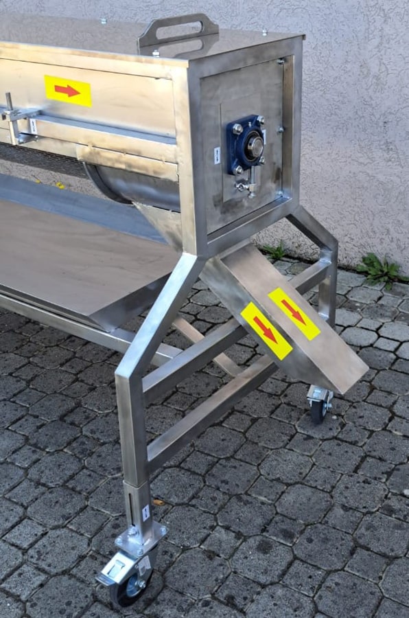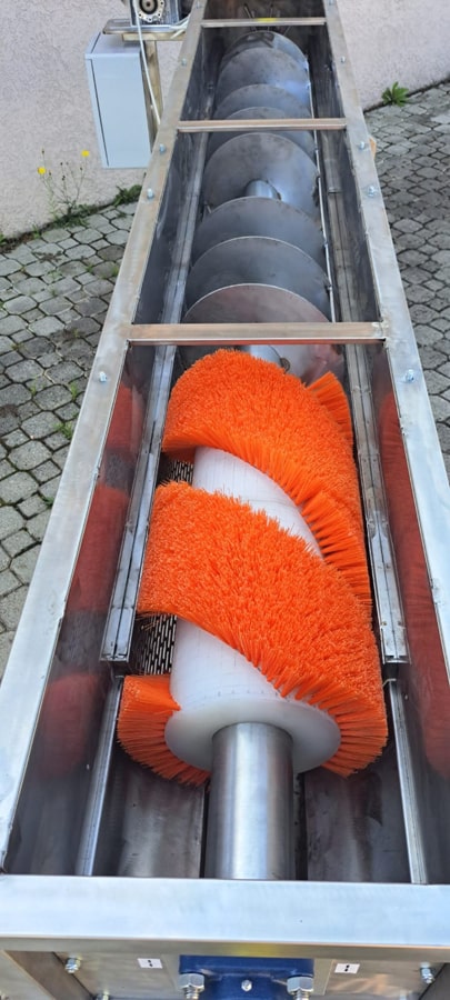 Il processo di pulizia si basa sul trasporto del prodotto congelato su una lamiera forata, con un albero comune che aziona sia il meccanismo di pulizia grossolana che le spazzole rotanti per la lucidatura fine.