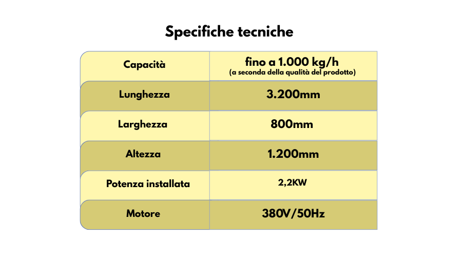 Il prodotto pulito prosegue lungo la linea tecnologica per ulteriori lavorazioni, mentre le impurità e i residui cadono attraverso la lamiera forata in una vasca di raccolta che si estende per tutta la lunghezza della macchina.
