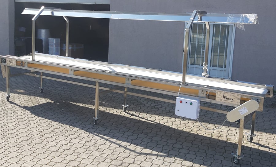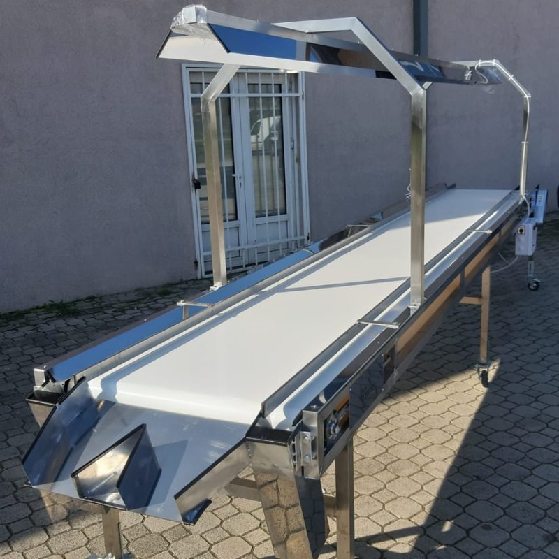 Tutte le parti a contatto con il prodotto sono realizzate con materiali idonei per uso alimentare, come acciaio inox (Inox) e nastro trasportatore in PVC.