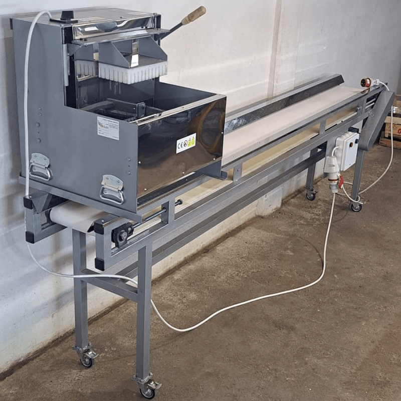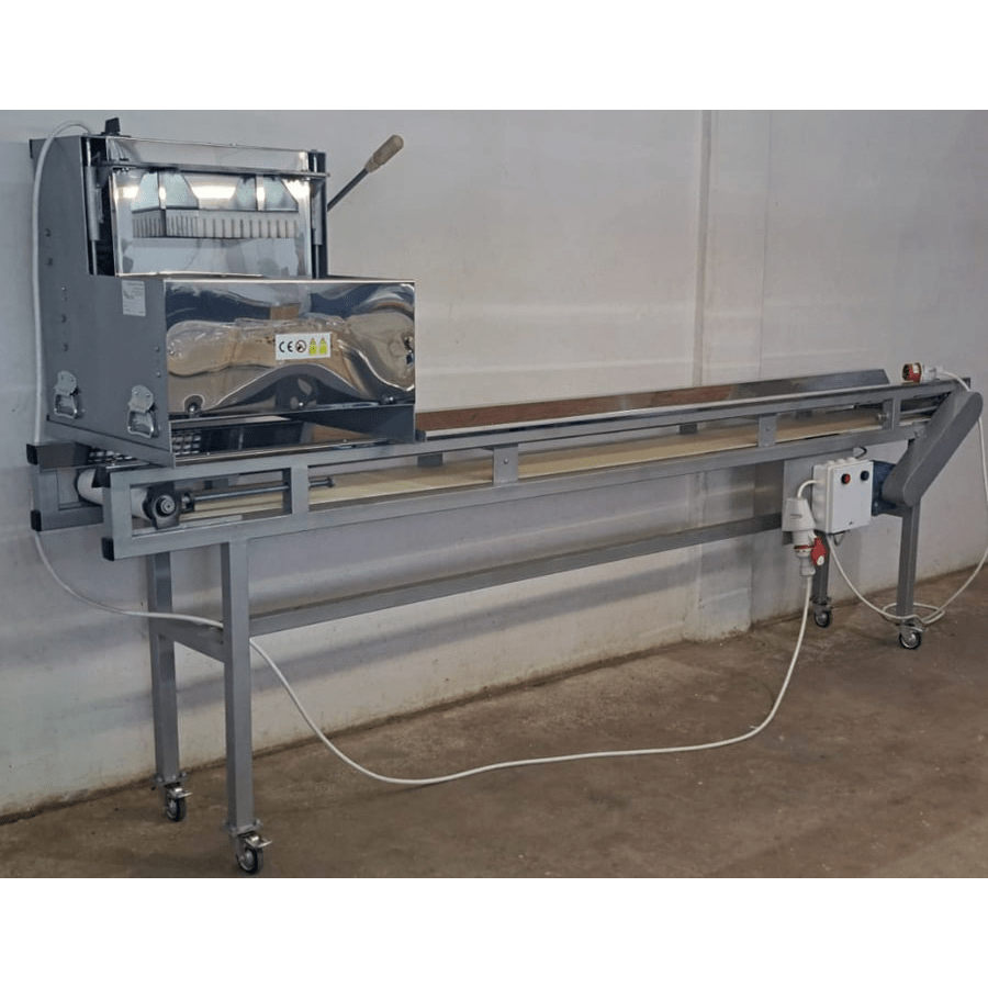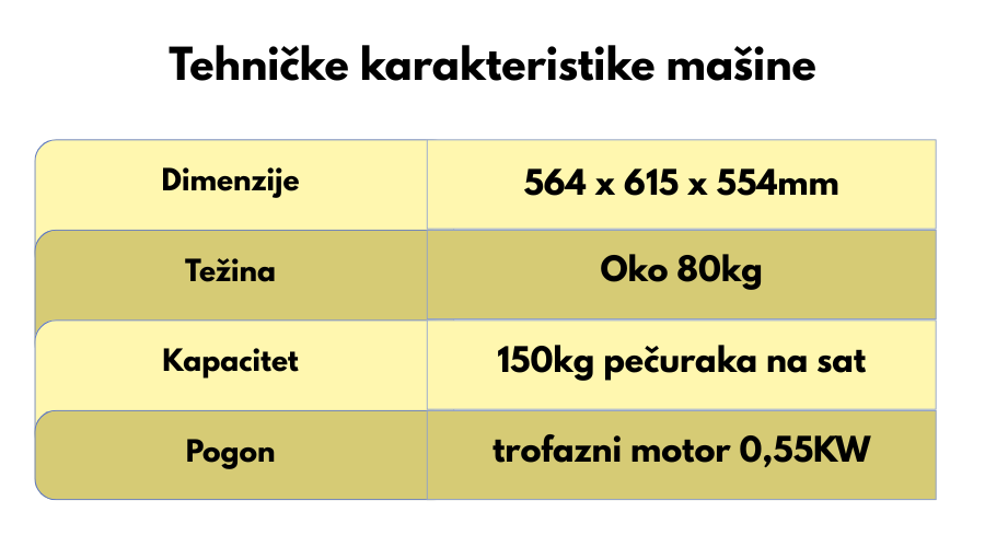 Model SMKF-2 namenjen je za sečenje smrznutih pečuraka na kocke, uz dodatak transportne trake koja automatski odvodi isečene komade do sledeće faze obrade.