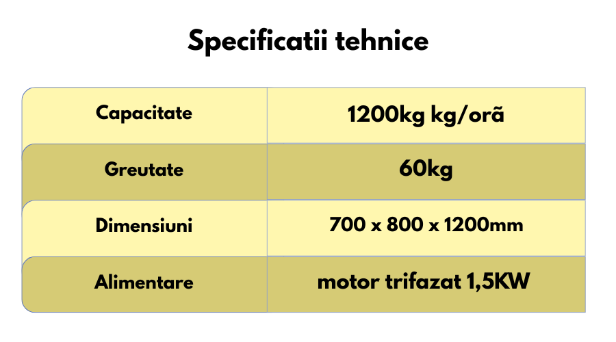 Cu o capacitate de pana la 1.200 kg pe ora, poate inlocui pana la 40 de muncitori manuali, crescand semnificativ eficienta procesului.