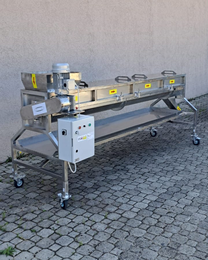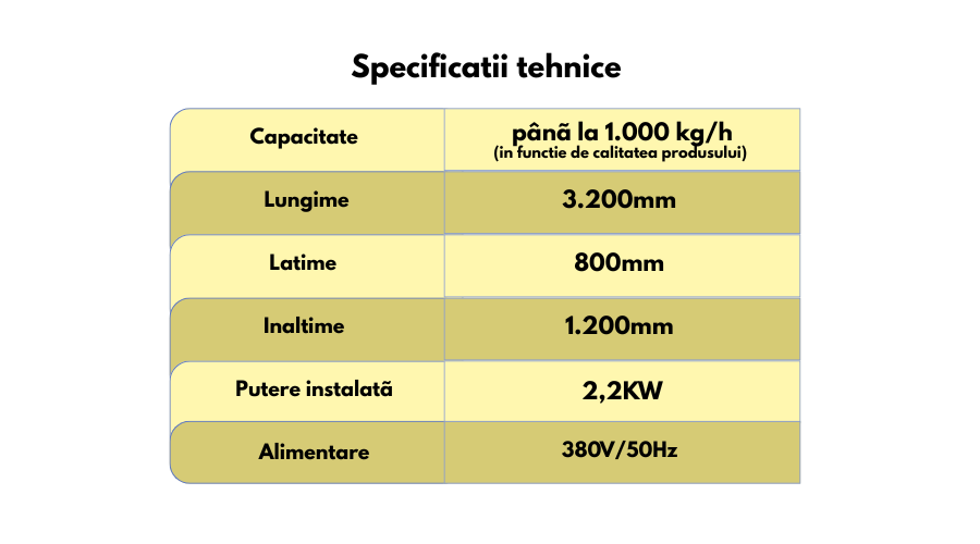 Produsul curatat continua pe linia de procesare catre etapele urmatoare, in timp ce impuritatile reziduale cad prin perforatiile tablei intr-un bazin de colectare amplasat pe intreaga lungime a masinii.