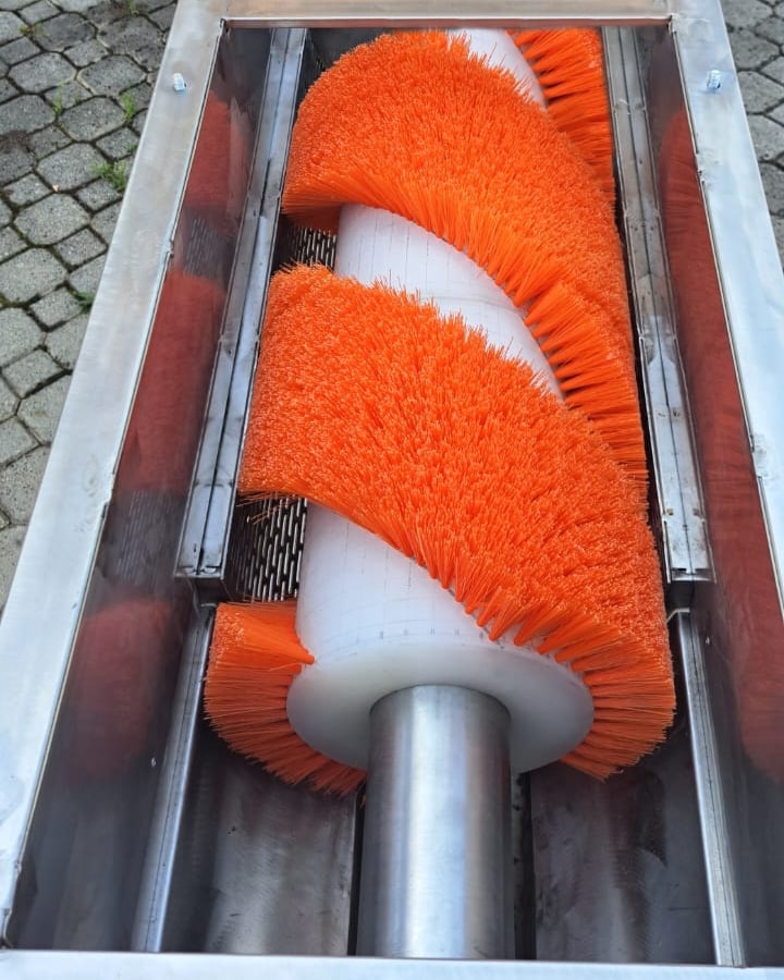Lustruirea are loc prin transportul produsului congelat pe o tabla perforata, asistat de perii rotative care curata delicat produsul.