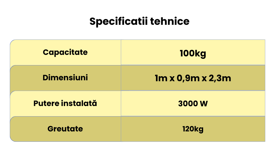 Uscatorul functioneaza pe baza de alimentare electrica si este disponibil in trei modele, cu capacitate zilnica de 50 kg, 100 kg, 200 kg si 400kg.