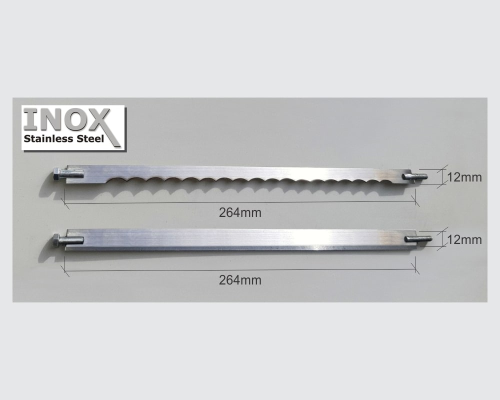 Запасные ножи для машины для нарезки грибов на слайсы изготовлены из улучшенной нержавеющей стали (Inox), устойчивой к воздействию кислот и воды.