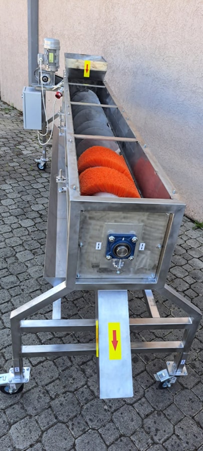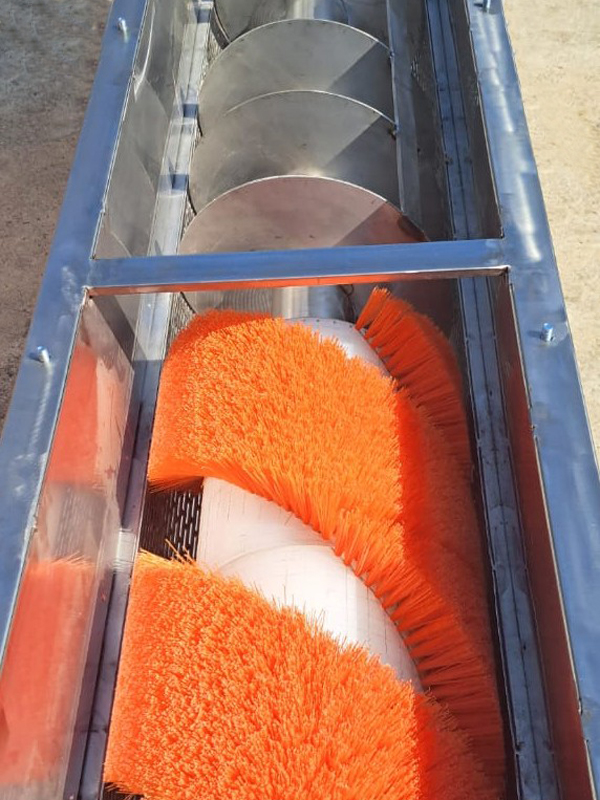 Грубая очистка осуществляется в первой части машины с помощью вращающейся спирали, которая удаляет крупные примеси, такие как плодоножки и листья.